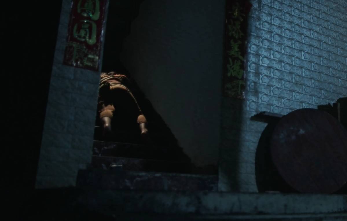 一个躲在暗处的男人,手里拿着绳索和黑色塑料袋,等着女孩靠近。