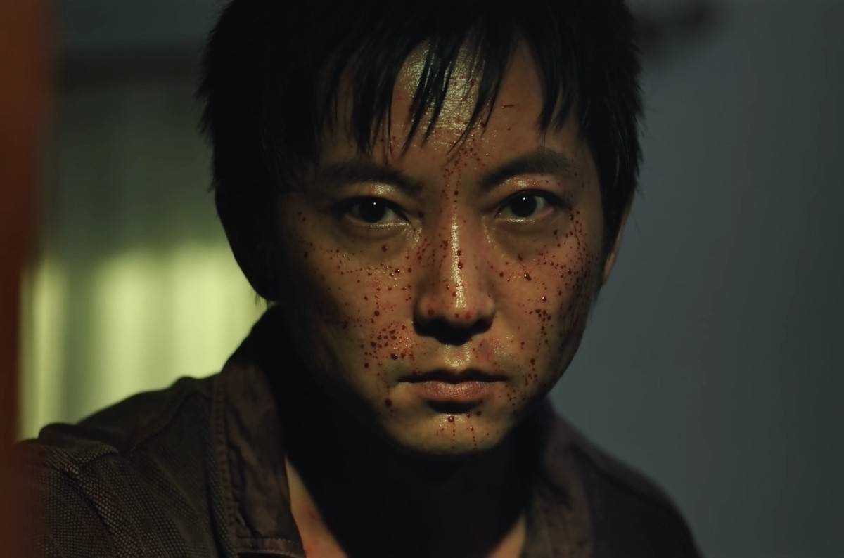 一个男人正在洗掉脸上的血迹,但在抬头的一瞬间,看到身后有人在挪动。