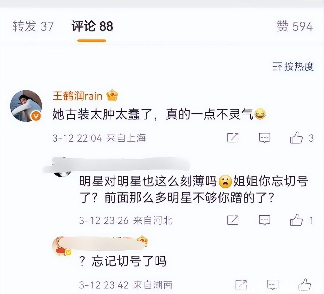 这事儿闹得,真让人有点摸不着头脑。3 月 12 日那天,微博热搜直接被两位女星的瓜给霸屏了,评论区简直炸开了锅。谁能想到,一句“古装太肿太蠢没灵气”的吐槽,竟然把王鹤润和王玉雯这两位平时没啥交集的姑娘,硬生生推到了风口浪尖。最离谱的是,这评论还是从王鹤润的大号发出来的,这下可好,全网都在扒细节,到底是手滑还是另有隐情?